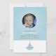 Un plaisir dans bleu et blanc ! Perfectionnez pour votre premier anniversaire de petit garçon. Son image est encadrée dans une fenêtre ronde et décorative de photo et la carte est embellie avec un voilier mignon.