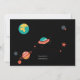 Une invitation colorée comportant un vaisseau spatial avec une fenêtre, des planètes et des étoiles de photo à un arrière-plan noir. Une invitation délicieuse pour votre partie d'espace-thème.