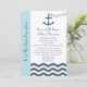 Cette invitation de réception de mariage après la cérémonie a un thème nautique et comporte les mots "Réception de mariage après la cérémonie" sur la gauche sur une bande bleu clair, mais le point central du design est une ancre avec une chaîne en forme de cœur jetée dans une mer en chevron ou en zigzag. Vous pouvez personnaliser l'invitation avec le nom de la mariée et du marié, la date et le lieu du mariage et tous les détails de votre invitation de réception de mariage après la cérémonie. Copyright henishouseofpaper