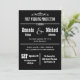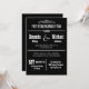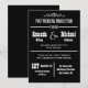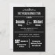 Cette invitation de réception de mariage est une invitation de style théâtre en noir et blanc ! Une décoration apparaît en haut avec les mots "Production de mariage après la cérémonie" juste en dessous, puis "Avec en vedette" avec les prénoms dans un style de caractères plus grand que les noms de famille. Vous pouvez personnaliser la conception de la typographie avec l'emplacement et la date de votre mariage. En bas, vous invitez vos invités à se joindre à vous pour une célébration avec la date, l'heure et le lieu indiqués sur l'invitation. Ce sont des invitations vraiment amusantes avec une touche créative unique pour annoncer votre réception de mariage. Copyright henishouseofpaper