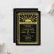 Cette invitation de réception de mariage après la cérémonie de style art déco est présentée en noir et or. Un soleil est le point central de l'invitation avec des touches art déco partout. Cette invitation a une superbe ambiance rétro et est une merveilleuse façon d'inviter vos invités à votre réception de mariage après la cérémonie avec un thème de mariage des années 20. Copyright henishouseofpaper