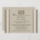 Cette invitation de réception après mariage présente un aspect de papier parchemin comme point focal avec un encart en toile de jute qui contient le monogramme de votre nom de famille et vos monogrammes initiaux de chaque côté. De part et d'autre de l'aspect papier parchemin se trouve une toile de jute marron clair avec une bande plus claire qui la traverse. Tous les détails de votre réception après mariage peuvent être personnalisés sur ce design, y compris la date et le lieu de votre mariage. Une merveilleuse façon d'inviter vos invités à une réception après mariage. Copyright henishouseofpaper