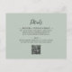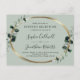 Faire-part de réception de mariage du soir ovale doré Eucalyptus Sage... Notre invitation de réception du soir unique en format carte postale "recto-verso" présente des feuilles d'eucalyptus vert émeraude sur une bordure ovale dorée fausse entourant le texte d'information de votre réception sur un fond vert sauge délicat. La calligraphie chic associée à des textes serif noirs et italiques expressifs créent un look classique et élégant pour votre invitation de réception. Le verso de l'invitation contient le code QR de votre site web de mariage ainsi que l'URL du site web écrit en texte afin que vos invités puissent répondre facilement en ligne et également consulter les détails dont ils ont besoin, y compris les options de repas, les hébergements disponibles et les sites de liste de mariage. Tout le texte d'exemple peut être facilement remplacé par vos propres informations sur le modèle de personnalisation. Les enveloppes pour cette invitation de taille carte postale sont disponibles à l