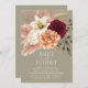 Cette invitation à la réception de mariage rustique présente des fleurs peintes à la main en bordeaux, ivoire, pêche et rougit avec des accents d'herbe pampas sur un arrière - plan taupe doux. Parfait pour une fête détendue et élégante après votre cérémonie, ce design convient aux mariages de automne d'été ou de début de saison avec un thème boho romantique ou campagne.