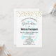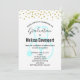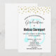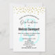 Une invitation pour une célébration de remise de diplôme d'infirmière. Conçue avec des points de confettis en faux or le long du haut. Un stéthoscope bleu pastel derrière le texte de la fête. Design simple et minimaliste.