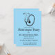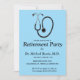 Cette carte d'invitation modifiable présente un stéthoscope sur fond bleu. Ci-dessous se trouvent les détails modifiables de l'événement. Cette carte est présentée pour la retraite d'un médecin, mais elle peut également être utilisée pour toute raison de célébration (diplôme, nouvel emploi, promotion, retraite) pour toute profession médicale.