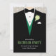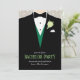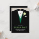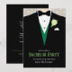 Invitation de fête de garçon élégante graphique avec un marié en smoking et gilet vert et une rose teintée verte. Modifiez ces invitations avec vos propres mots, le nom du marié et les détails de l'événement de pré-mariage. © Conception unique et illustration graphique par Sarah Trett. www.sarahtrett.com pour www.mylittleedenweddings.com