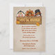 Une invitation lunatique de thanksgiving avec le pèlerin de l'homme et de femme et une dinde aussi, regardant au-dessus d'un signe de bois-regard.
