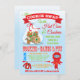 Cute Cookie Exchange Swap Invitation avec un grand sac de cookies de Noël, bannières, pull moche, ruban de prix et de la typographie amusante le tout sur un arrière - plan bleu pâle. Idéal pour les enfants ou une fête pour adultes. Illustration tirée à la main par McBooboo.