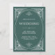 Ces invitations de mariage séduisantes présentent une touche moderne d'art déco classique. Un cadre géométrique et orné, festif et très clair argent/blanc décorent un élégant arrière - plan vert festif pour un look mariage des années 1920, spectaculaire, glamour et vintage, parfait pour votre mariage de Noël. Ta photo va à l'arrière.