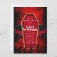 Vous aimerez ce cercueil aux ailes de chauve-souris et aux arbres éffrayants sur un arrière - plan fumé rouge et noir. Des invitations correspondantes sont disponibles.