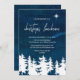 Cette carte d'invitation pour le déjeuner de noël étoilé est parfaite pour un événement de fête religieuse. Le design comprend une scène de forêt hivernale avec un ciel d'aquarelle marine et une étoile brillante de bethlehem.