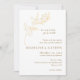 La faire-part de mariage présente un design minimaliste et élégant avec un arrière - plan blanc doux et une illustration botanique en or délicate dans le coin supérieur gauche. La typographie associe des polices séif audacieuses et cursives, avec du texte doré ou brun chaud qui complète le design floral. Sa disposition espacée crée une esthétique raffinée, intemporelle et sophistiquée.