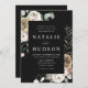 Elegant winter floral wedding invitations featuring your wedding details displayed in dark green lettering nestled inside of a boho floral frame with a black background. The winter flowers feature a color palette of dusty rose, light pink, ivory, and soft golden yellow with eucalyptus leaves and winter foliage in shades of sage green and rich forest green.