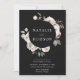 Élégantes invitations de mariage florales hivernales avec vos noms encerclés par une couronne de fleurs d'aquarelle et feuillage avec un arrière - plan noir. Les fleurs d'hiver sont recouvertes d'une palette de couleurs de rose, rose clair, ivoire et jaune doré doux, avec des feuilles d'eucalyptus et des feuillages d'hiver dans des tons vert sauge et vert forêt riche.