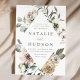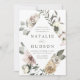 Élégantes invitations de mariage florales hivernales avec vos détails mariages affichés en lettrage vert foncé niché à l'intérieur d'un cadre fleuri boho. Les fleurs d'hiver sont recouvertes d'une palette de couleurs de rose, rose clair, ivoire et jaune doré doux, avec des feuilles d'eucalyptus et des feuillages d'hiver dans des tons vert sauge et vert forêt riche.