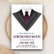 Invitation vos groomsmen avec cette carte de demande moderne avec un tuxedo classique avec une cravate violette contre un arrière - plan blanc. Ajoutez simplement les détails de votre événement sur ce modèle facile à utiliser pour en faire une invitation unique. Retournez la carte pour révéler un motif rayé noir et blanc au dos de la carte.