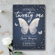 Un denim moderne, élégant et classe, modèle d'invitation 21e anniversaire de diamants avec un arrière - plan denim, le mot vingt et un dans le script de calligraphie moderne, papillons en dentelle (c'est un effet numérique, pas une vraie dentelle !) et typographie en blanc. Une invitation chic "denim and diamants" à vingt et unième anniversaire pour une fille qui aime les papillons. Un thème papillon parfait pour un anniversaire de vingt et un jalons pour elle.