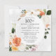 Honorer une femme spéciale avec cette élégante invitation de fête du 100e anniversaire. Les fleurs orange et blanches brûlées sont nichées dans des feuilles verts formant un cadre botanique moderne. Motif en dentelle blanche crée un bel arrière - plan. Tout le texte peut être édité, vous pouvez ainsi décrire votre célébration spéciale parfaitement
