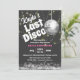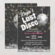 © Socialite Designs Inc. & LICENSORS. Célébrez une soirée Disco Bachelorette en invitant les invités avec cette dernière invitation de soirée disco bachelorette rétro. Les couleurs sont argent, blanc, rose et gris. Le design incorpore une boule de disco argent et des lumières à cordes or / blanc comme arrière - plan.