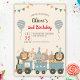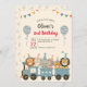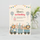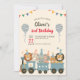 Cette adorable invitation d'anniversaire personnalisée présente une collection d'animaux de safari mignons et fantaisistes, tous en casquettes colorés, dans un train de charme.