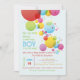 Invitation colorée de ballons ou de points flottants dans les tons rouge, bleu, vert et or. Présenté ici comme une invitation baby shower, ce design est polyvalent et peut être utilisé pour n'importe quelle célébration heureuse.La carte est facile à customiser avec votre libellé, police, couleur de police et choix de six types de papier.