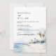 Cette belle invitation à un mariage sur la plage présente une aquarelle sereine illustrant un littoral tropical avec des vagues douces, des plages de sable doux et des palmiers balançoires. Le délicat mélange de blues doux, de neutres sablonneux et de teintes vertes crée une atmosphère paisible et romantique, idéale pour les mariages côtiers ou de destination. La mise en page minimaliste présente une typographie élégante, avec un mélange de polices sans-serif modernes et de scripts gracieux qui ajoutent une touche de sophistication et de charme. L'arrière - plan blanche et propre donne une impression de lumière et d'aération, ce qui permet à la scène de plage rêvée de se démarquer tout en gardant l'accent sur les détails mariages. Ce design saisit sans effort l'élégance détendue d'une fête balnéaire, ce qui en fait un choix idéal pour les couples qui souhaitent séjourner en bord de mer ou en mariage d'inspiration tropicale.