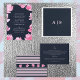 Détails du mariage Carte de boîtier. Deux hôtels. Navette. Cocktails. Site mariage. Arrière - plan de la marine. Texte rose. Le rose et la marine rayés en arrière avec des accents floraux roses.