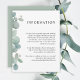 Une belle bordure de verdure d'eucalyptus à l'aquarelle met en valeur cette carte d'informations de mariage moderne utilisée pour fournir à vos invités de mariage des détails, des informations sur les hôtels, votre site web de mariage ou d'autres informations utiles concernant votre mariage. Personnalisez le texte d'exemple indiqué dans le modèle de texte avec vos informations souhaitées. Ces cartes peuvent être envoyées en pièce jointe avec vos invitations de mariage. Une gamme de produits de papeterie assortis est disponible dans ce design pour coordonner votre mariage ou événement avec un beau style.