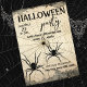Deux araignées noires rampant de leur toile d'araignée devant un arrière - plan en papier déchirée gris, Simple et moderne, facile à customiser pour vos soirées costumées Halloween. L'envers de cette invitation de fête d'Halloween présente la même illustration des deux araignées noires et de la toile d'araignée. Bonne fête !