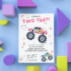 Deux Fast 2nd Birthday Kids Monster Car Trucks Invitation présente des camions monstres mignons et colorés avec le texte "Two Fast" dans le script moderne de typographie rose accentué avec le numéro 2 et doodles. Parfait pour les enfants fêtes de deuxième anniversaire. Envoyez par la poste ou téléchargez simplement l'invitation numérique partageable téléchargeable. Conçu par Evco Studio. Pour la coordination des éléments, voir www.zazzle.com/store/evcostudio