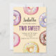 Adorable invitation de fête de 2ème anniversaire. Des beignets aquarellés présentés sur un arrière - plan ivoire/beige. Tout le texte est personnalisable avec le nom de l'enfant et les détails de la fête.