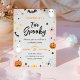 Invitation d'anniversaire "Deux filles éffrayantes" pour le deuxième anniversaire. Doté de fantômes, de jack-o-lanternes, de chauves-souris, de maïs-bonbons et plus encore, avec une aquarelle rose peinte en arrière.