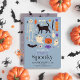 Cette mignonne invitation "éffrayante" de l'halloween garçon 2ème/deuxième anniversaire comporte un arrière - plan bleu avec des motifs Halloween, y compris un chat noir, chauve-souris, fantômes, citrouille, bonbons, broom, squelette, lèvres de vampire et eyeball. L'envers est constitué d'un arrière - plan violet avec des motifs de toile d'araignée. Personnalisez-le selon vos besoins. Vous pouvez trouver des produits correspondants dans mon magasin.