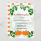 Invitation à une baby shower sur le thème des citrouilles d'Halloween avec un design de deux citrouilles peintes à l'aquarelle orange et verte chaudes.