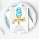 Carte d'invitation à la fête d'anniversaire du garçon jumeau à thème crème glacée mignonne avec aquarelle illustration de glaces bleues sur cône gaufre. Il y a de faux éclats d'or autour. Le texte de la bannière dit "deux boules sont meilleures qu'une". Parfait pour l'anniversaire d'un garçon en été.