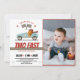 Two Fast Race Car Birthday Invitation With Photo fait partie de la collection Race Car Birthday. Ce produit comprend voiture de course, drapeaux à damiers, animal. Fait principalement en bleu et rouge avec des polices décoratives. Explorez d'autres produits correspondants dans notre magasin.