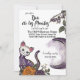 Cette invitation magique et enchanteresse de la fête d'Halloween présente le thème gothique Dia de los Muertos Day of the Dead. Un squelette illustré est représenté en bas à gauche avec des accents floraux. Une lune de croissant violet est photographiée à droite avec une mignonne petite chauve-souris au-dessus.