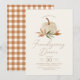 Invitez vos amis et votre famille à un dîner de Thanksgiving avec cette invitation élégante, avec une citrouille à l'aquarelle, du feuillage d'automne et un motif à carreaux orange au verso.