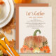 Invitation à dîner Thanksgiving pour amis et/ou famille. Un citrouille orange et des feuilles d'or brillant avec un texte, "Rassemblons-nous et rendons grâce." Ajoutez vos informations sur le dîner et l'emplacement à cette belle carte.