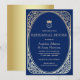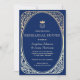 Dîner de répétition bleu marine simple, moderne et élégant Invitation avec monogramme de couronne d'or royal au sommet, et cadre floral art-déco.