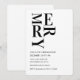 Faites une déclaration audacieuse en cette période de fêtes avec cette invitation minimaliste à dîner de Noël. Avec une typographie noire frappante orthographiée MERRY dans un design vertical moderne, ce design épuré et sophistiqué est parfait pour ceux qui aiment un style de vacances élégant et contemporain. Idéale pour les dîners de Noël, les fêtes de fin d'année ou les fêtes festives, cette invitation unique allie simplicité et élégance. Customisez avec vos propres détails d'événement pour une carte de célébration de vacances élégante.