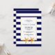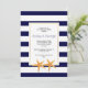 Cette excellente invitation à la répétition de mariage d'été sur la plage présente une paire d'étoiles de mer jumelée à un motif bleu marine et blanc. Votre texte est dans un cadre blanc avec contour doré. Le dos est orné d'un motif rayé bleu marine et blanc.