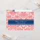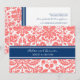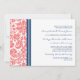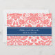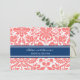 Invitations personnalisées pour le dîner de soirée dans le bleu marine moderne et élégant, rose pêche orange et blanc chic et classique floral damask motif vintage. Personnalisez le texte pour créer une invitation unique pour votre dîner de répétition mariage. Contactez-nous pour demander un changement de couleur. Disponible dans de nombreux produits mariages correspondants.