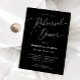 Dîner de répétition minimal mariage avec police de script moderne sur un arrière - plan noir. Ce modèle a déjà des textes qui contiennent toutes les informations dont vous avez besoin pour votre événement. Les textes sont facilement personnalisables en ligne.