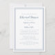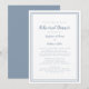 Un design d'invitation de dîner de répétition de mariage en bleu poussiéreux et blanc simple et chic présente un design contemporain minimaliste simple avec une double bordure encadrée en bleu poussiéreux sur un fond blanc croustillant. Personnalisez le design de mariage avec vos détails en lettrage tendance et en script en bleu. Le dos correspond à un bleu uni. Pour de meilleurs résultats, remplacez les détails du modèle par vos propres détails en laissant de l'espace entre les paragraphes comme dans l'exemple et utilisez toutes les lettres minuscules où cela est spécifié. Envoyez un e-mail à invitationsuites@gmail.com pour toute question ou demande personnalisée.
