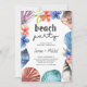 Plage fêtrement Dîner invitation, encadré de coquillages d'aquarelle et de fleurs tropicales. "beach party" est écrit à la main et le texte restant est entièrement modifiable.