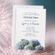 Dîner de répétition florale modèle avec fleurs d'hydrangée bleu clair. Livre blanc avec texte bleu foncé et libellé qui inclut les noms de ceux qui invitent les invités. Un bouquet de fleurs avec feuilles fait une jolie bordure le long du fond du papier, qui a de nombreuses options de mise à niveau, ou choisir le téléchargement instantané.