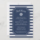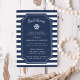 Les invitations à dîner à thème marin d'été en bleu et blanc de la marine classique présentent un arrière - plan rayé marine et blanc avec vos informations d'événement en blanc sur un élément central bleu marine, accentué par l'illustration de la roue d'un navire. Idéal pour des dîners de répétition sur yachts, voiliers ou dîners-croisière à la marina, club nautique ou lieux thématiques nautiques. Les invitations s'inversent à un motif de minuscules ancrages de marine.