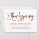 Invitez vos amis et votre famille au dîner de Thanksgiving avec ces invitations élégantes ! Un fond blanc présente une typographie manuscrite moderne riche et marron. Le verso de l'invitation de Thanksgiving présente un beau motif de feuilles d'automne.